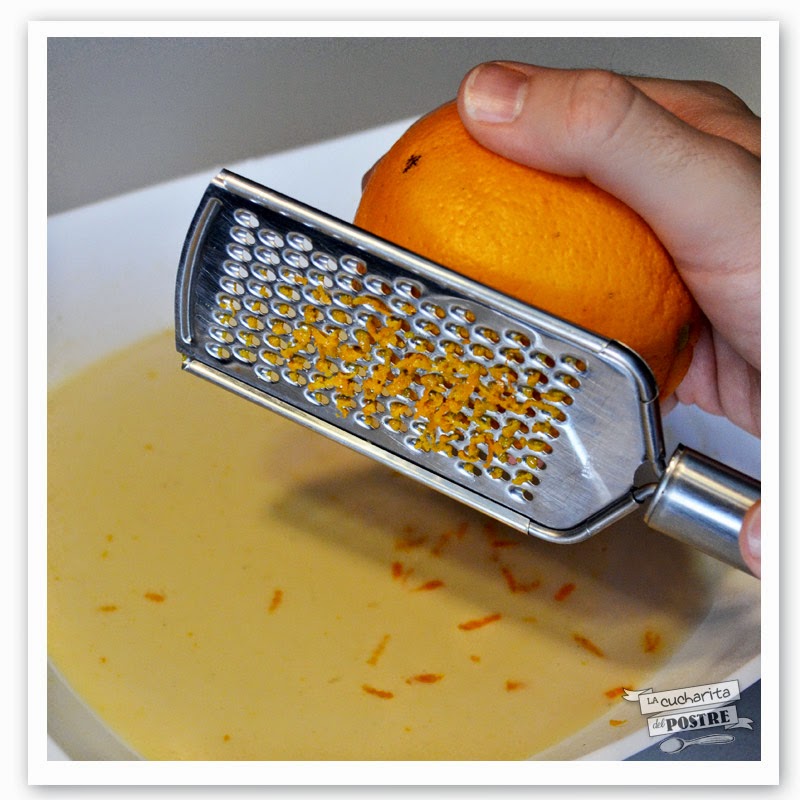 8. Por último, añade la ralladura de una naranja, remueve todo bien para que no queden grumos y deja reposar en la nevera alrededor de 2-3 horas cubriendo el recipiente con film transparente.