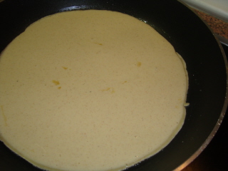 2. En una sartén se le unta un poco de mantequilla y se echa una cucharada de la masa, se mueve la sartén hasta que queda cubierta entera, cuando está hecha por un lado se le da la vuelta y se hace por el otro lado, como si fuera una tortilla.
