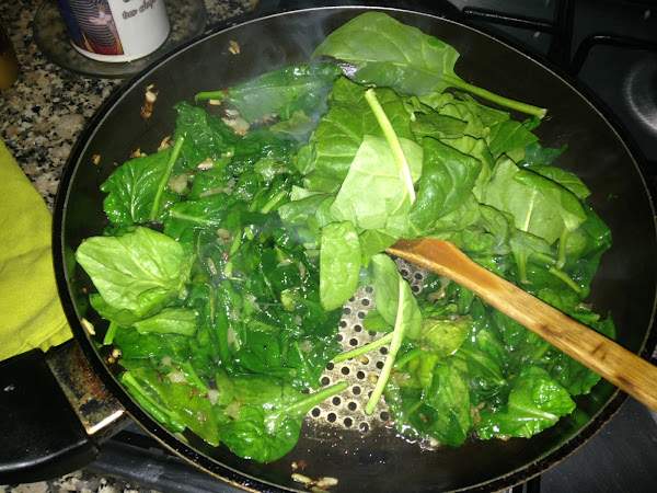 Empezaremos preparando el relleno picando la cebolla muy finita. Cuando esté pochada añadimos los 300 gramos de espinacas en tandas ya que todas de golpe no cabrán al tener muchho volumen.