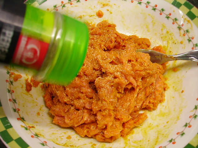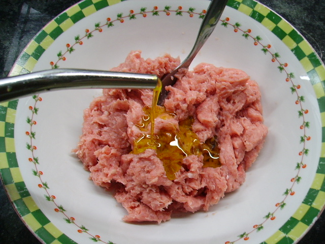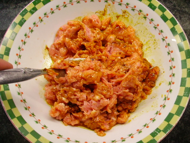 1.- Mezclar la carne con un poco aceite y el resto de las especias al gusto y dejar macerar mientras la se hacen los bollos. Se puede echar un poco de agua para que los sabores mezclen mejor.