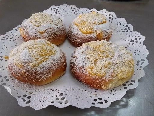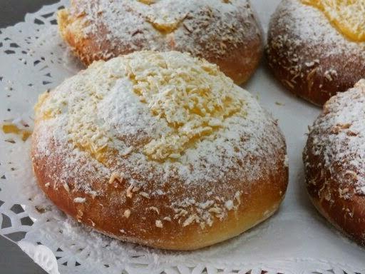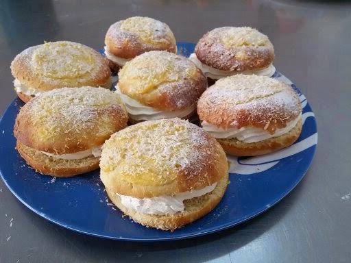 Preparación: En el bol de la amasadora o en un bol cualquiera, si la vamos a hacer a mano, poner las dos clases de harina, la leche, los huevos, el azúcar, la pasta de naranja, el mejorante si se usa y la levadura. Amasar hasta obtener una masa lisa y homogénea, entonces añadir la sal y la mantequilla y volver a amasar. Una vez amasada de nuevo, tapar y dejar fermentar en bloque a temperatura ambiente o en la nevera hasta el día siguiente. Pasado el tiempo, pesar porciones de 65-70 gramos y bolear. Colocar en bandeja de horno forrada con papel y pincelar con huevo. Dejar fermentar hasta que doblen su volumen. entonces volver a pincelar con huevo haciéndolo con mucho cuidado para no desgasificar las piezas y cocer en el horno a 190º C durante 15 minutos, eso depende de los hornos. Retirar del horno y dejar enfriar totalmente sobre rejilla. Montar la nata (crema de leche) que deberá estar bien fría y cuando esté a medio montar añadir el azúcar glas. terminar de montar, poner en manga pastelera con boquilla rizada gruesa y dejar en la nevera hasta el momento de utilizarla. Cuando los bollos estén fríos, abrir con un cuchillo de sierra, rellenar con abundante nata (crema de leche) y espolvorear con azúcar glas.