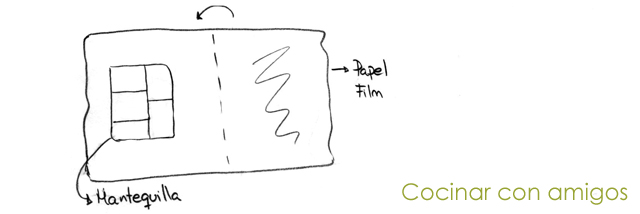 Cogemos un metro y 200 grs. de mantequilla y formaremos una plancha cuadrada con los bodes rectos, para ellos colocamos un papel film, en un lateral vamos colocando porciones de mantequilla de 1 cm. de grosor y formamos un cuadrado, no tienen que quedar agujeros entre los retales de mantequilla.