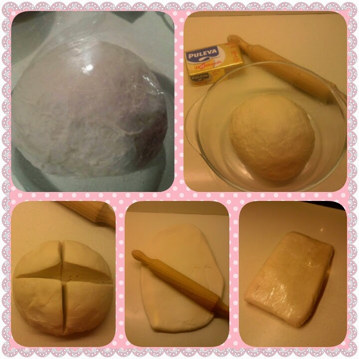 Ahora viene la acción. Vamos a sacar de la nevera una pastilla de mantequilla de 250gr mientras preparamos lo necesario. Cogemos la masa y le hacemos un corte profundo en forma de cruz. Mientras ponemos la mantequilla en una bolsa y aplanamos dejándola a un grosor de unos 4 mm.