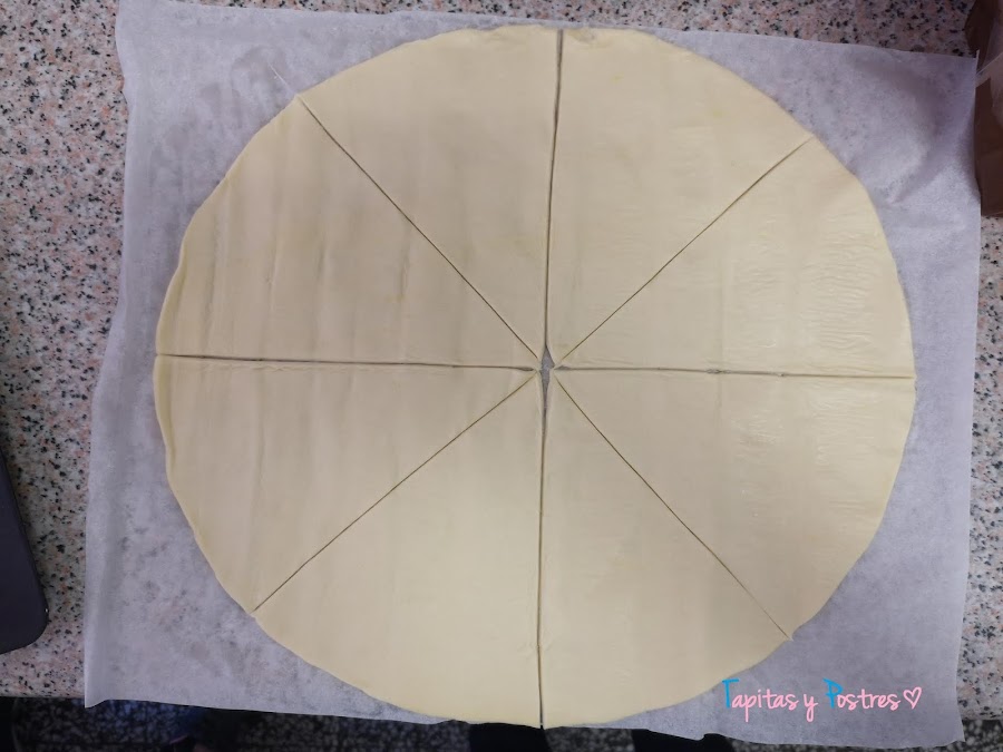 Extendemos la lámina de hojaldre y la cortamos en 8 partes iguales.Tendremos así 8 triángulos.