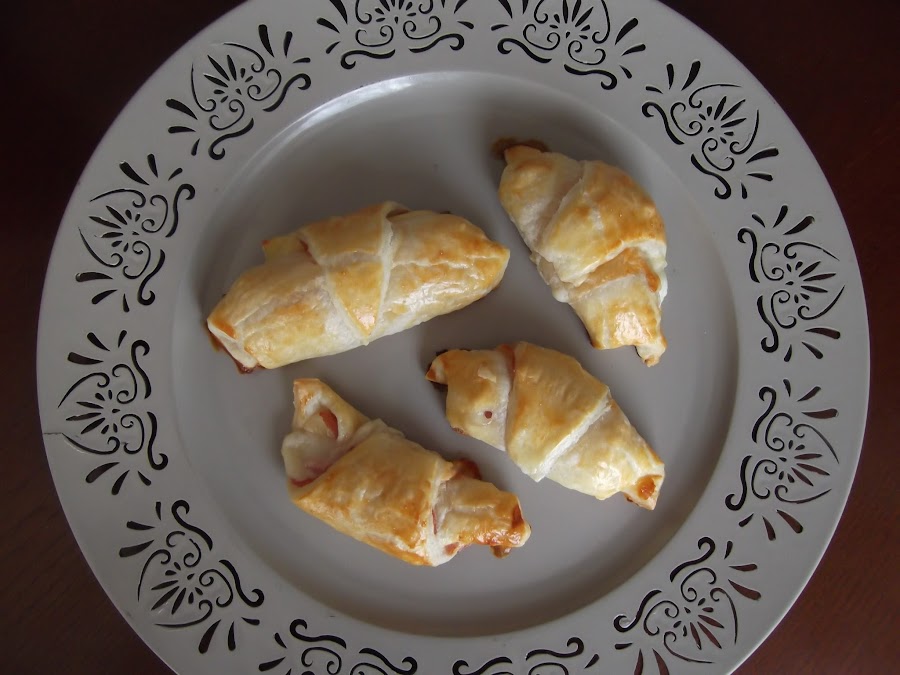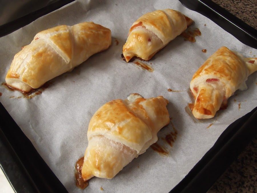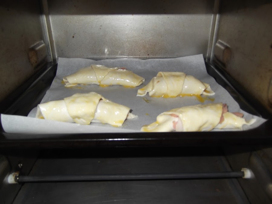 Una vez que los habéis rellenados, los enrolláis y le dais forma de croissant. Los colocáis en una bandeja de horno, que previamente habréis forrado con papel para horno para que no se os peguen y los pintáis con huevo, podéis echarle sésamo por encima, aunque yo he preferido que no, porque no me gusta mucho.