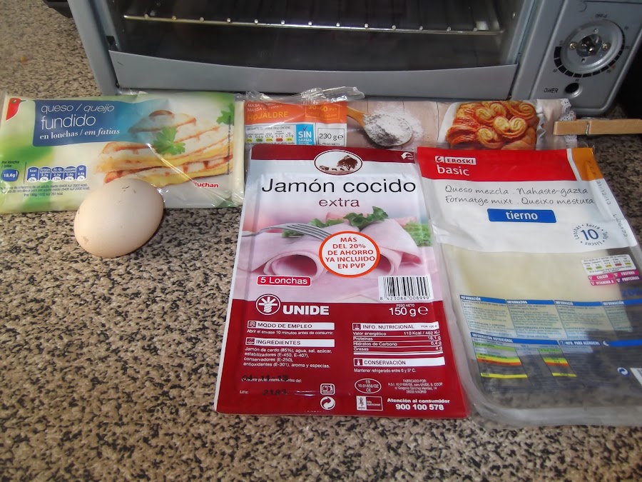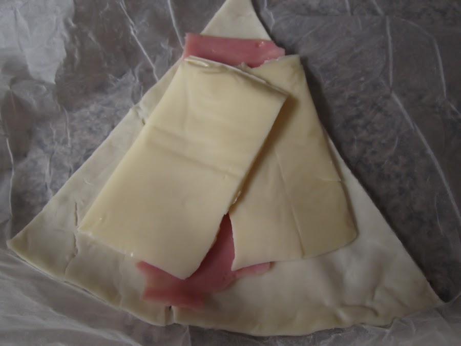 El siguiente paso es rellenar cada porción de masa, ponéis un trozo de queso y otro de jamón o dos de queso y uno de jamón como queráis. Podéis utilizar tranchetes u otro queso de lonchas, si utilizáis los primeros se os van a quedar más derretidos, pero eso como más os gusten.