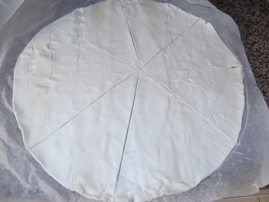 Lo primero que hacemos es estirar la masa de hojaldre. Dejarla un rato fuera de la nevera para que se pueda manejar mejor. Ahora tenéis que cortarla como si fuera una pizza para que os salgan ocho porciones.