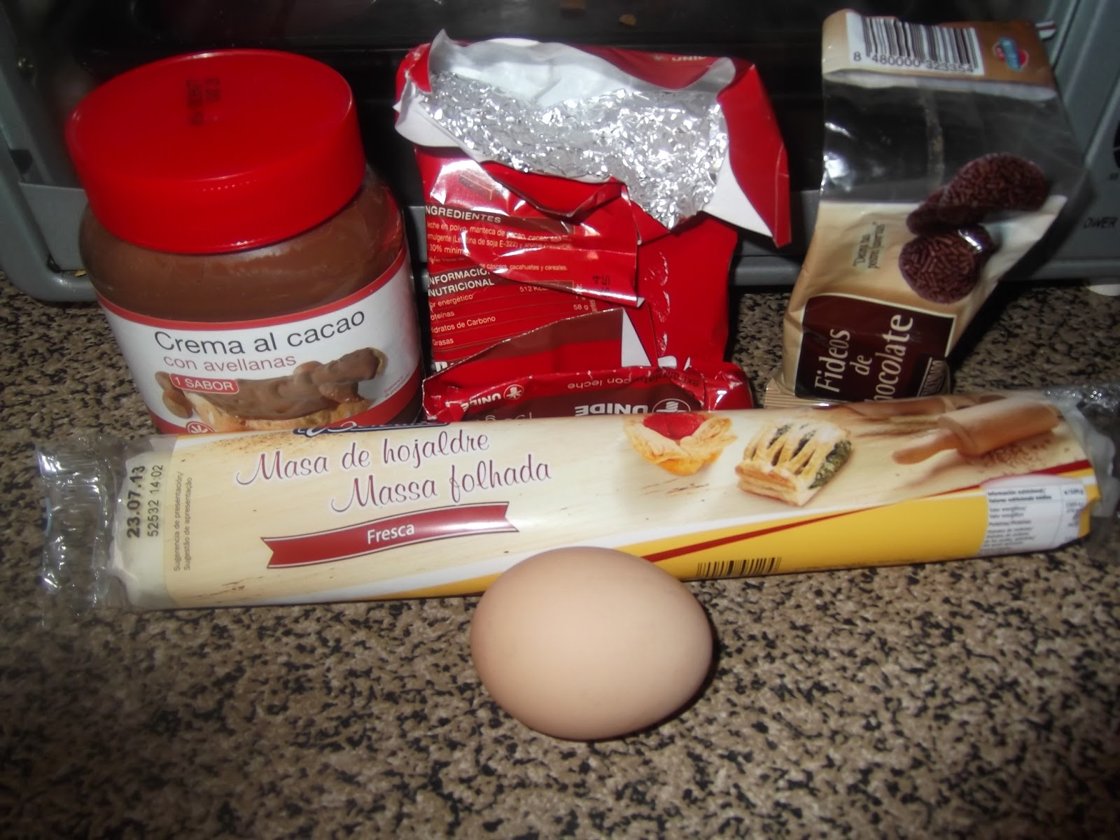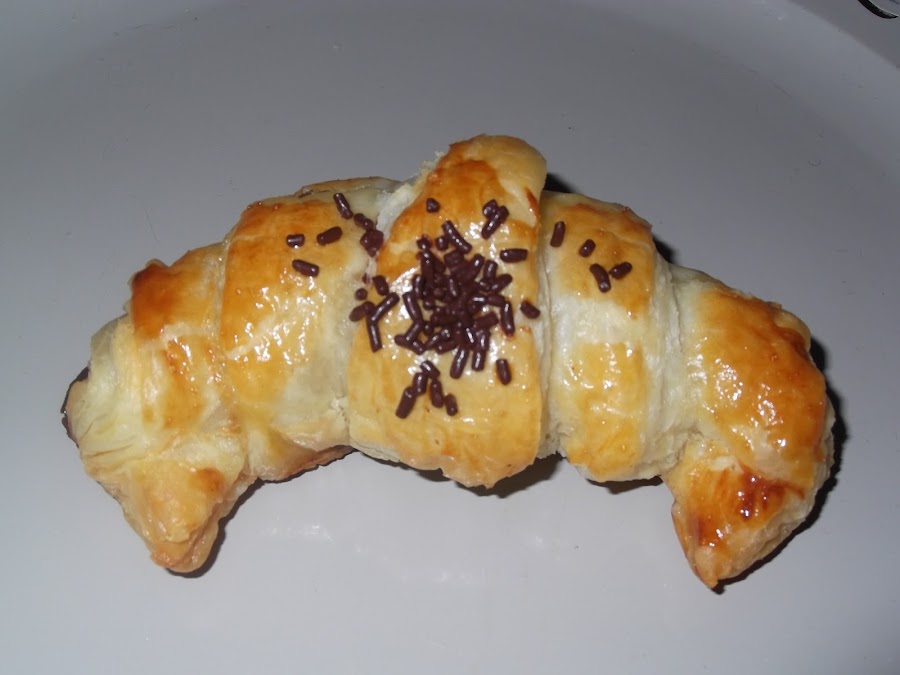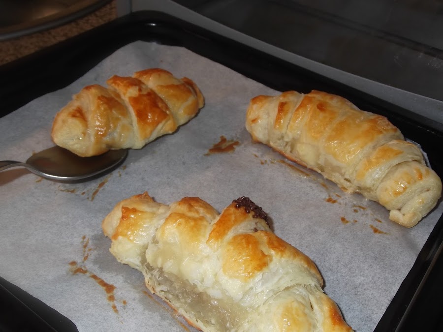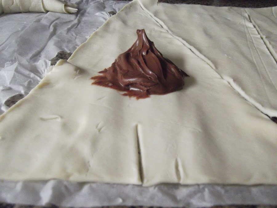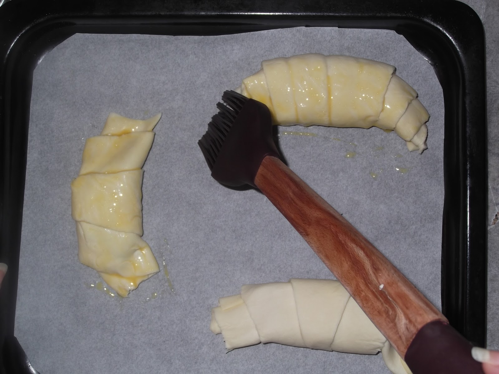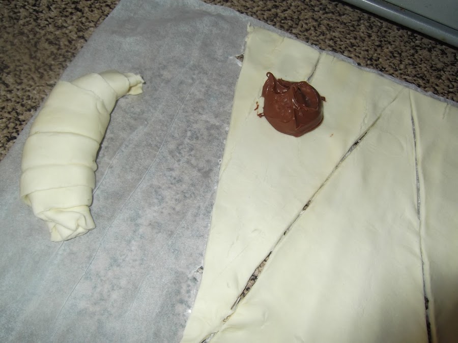 Una vez que tienes dibujados los triángulos les pegas un corte en la base, les pones un poco de nocilla y los comienzan a enrollar. Una vez que tienes una especie de rollo sacas las puntas hacia fuera para darles formas de croissant. A continuación los colocas en una bandeja apta para horno (poner papel para horno para que no se peguen) y los pintas con el huevo batido. Si quieres les puedes añadir fideos de chocolate por encima.