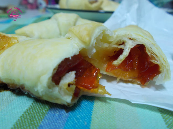 Debido a que en algunos países los croissant son conocidos como cuernitos, me pareció de lo más indicado preparar estos deliciosos croissant de hojaldre rellenos de queso de cabra y mermelada de pimiento rojo para nuestra fiesta.