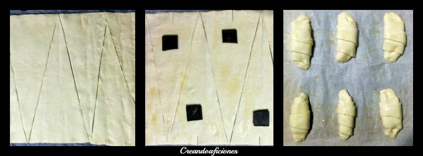 Podemos poner chocolate, crema de cacao, mermelada....y hacemos un corte pequeño justo en la base del triángulo.