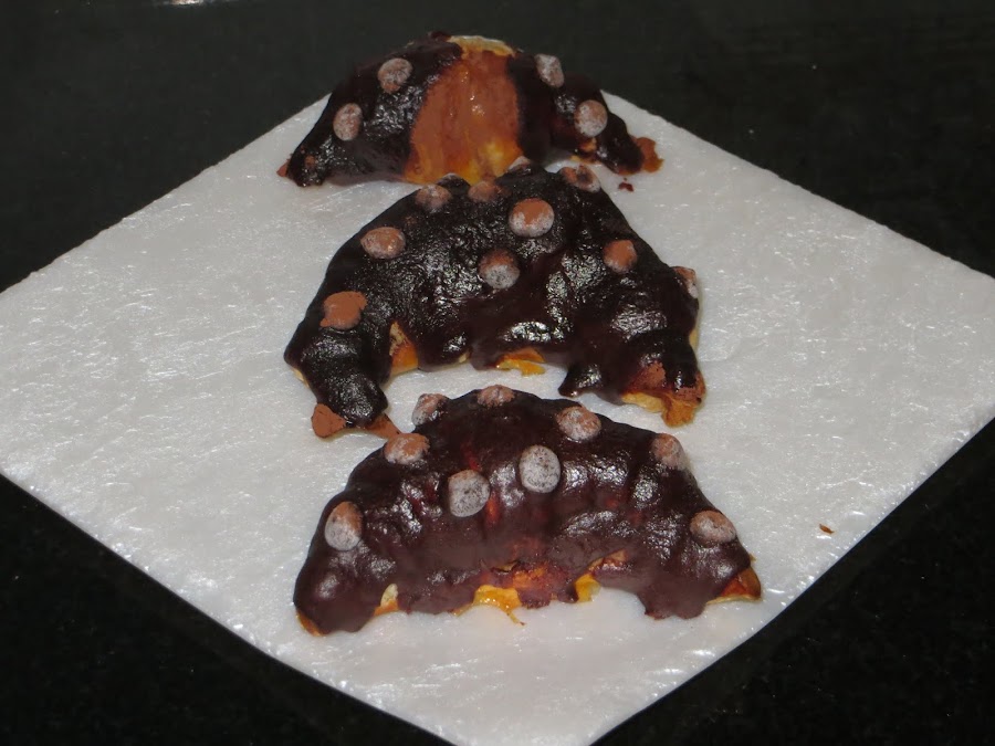 Cuando saqueéis los croissants, los ponéis en una rejilla y los bañáis con el chocolate que habéis derretido, le añadís las pepitas de chocolate y le tamizáis un poco de cacao en polvo, a mi personalmente me gustan recién hechos, pero los podéis guardar en una tartera y utilizarlos al día siguiente.