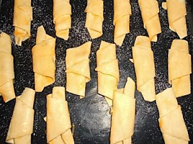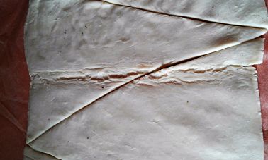 Corta la masa de esta forma, haciendo triángulos ( siento que la foto no sea muy buena ). Para cortar, usa un cuchillo pero no lo deslices, ponlo encima y aprieta, de otra forma te arriesgas a aplastar el hojaldre y no subirá: