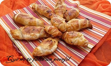 Estira la masa de hojaldre sobre la encimera, espolvorea un poco de harina sobre ella , antes de ponerla para que no se pegue a la mesa de trabajo. Si quieres que salgan más finos, puedes estirar la masa un poco con un rodillo ( yo no lo hice ).