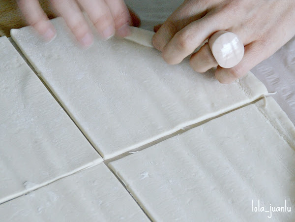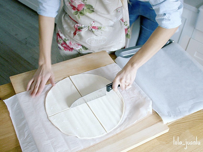 Si es redondo, cortaremos cuatro porciones iguales. Es mejor cortar sin arrastrar el cuchillo para que el hojaldre suba por todos los lados por igual.
