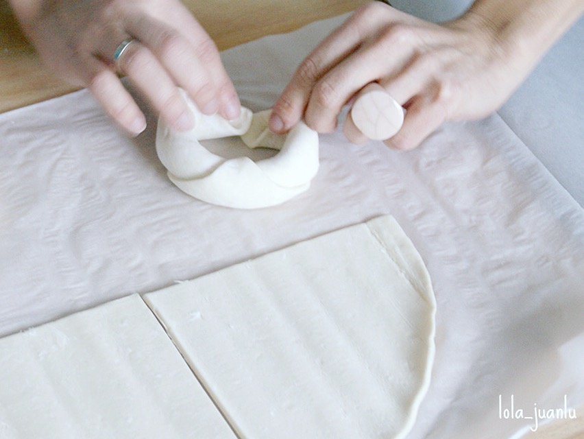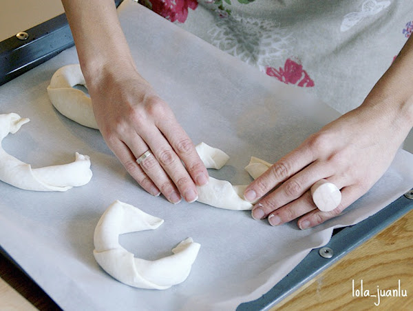 Y ahora para hacer nuestros croissants, sólo tenemos que coger los extremos el triángulo de masa y enrollarlos sobre sí mismos.
