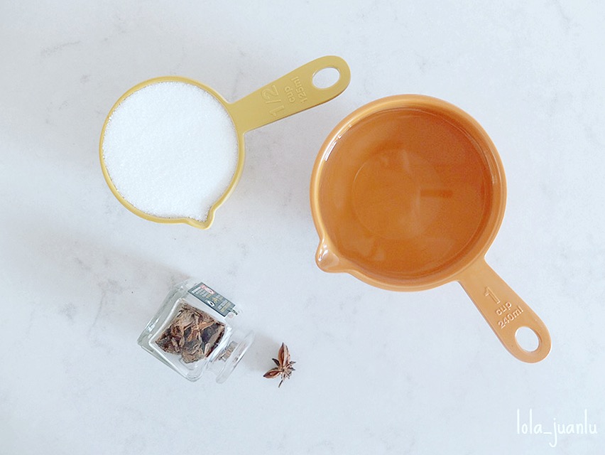 Empezamos elaborando el almíbar, para ello, en un cazo a fuego medio echamos el agua y el azúcar y removemos hasta que se disuelva. Le agregamos el anís estrellado y lo llevamos a ebullición durante 8 minutos sin remover. Apartamos del fuego y dejamos enfriar.