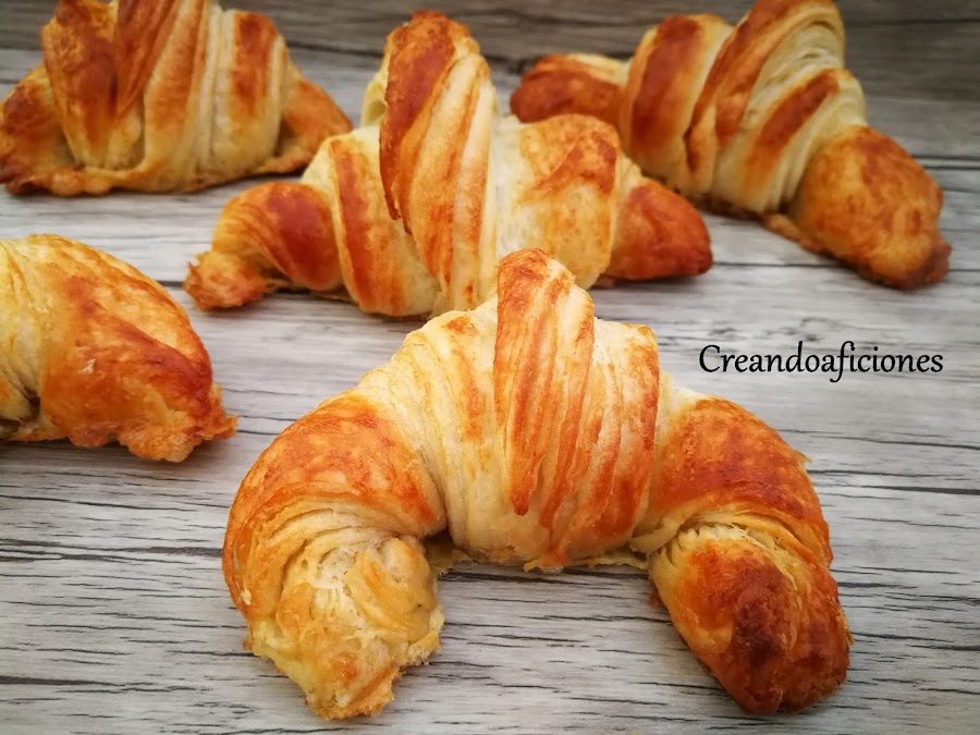 Con un corta pizza hacemos triángulos y en la parte ancha del triángulo hacemos un pequeño corte, enrollamos las puntas y giramos la masa arrastrándola sobre si misma, dejando siempre la punta por debajo para que no se levante en el horno.