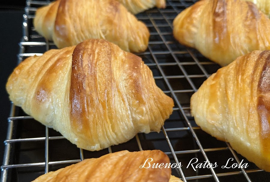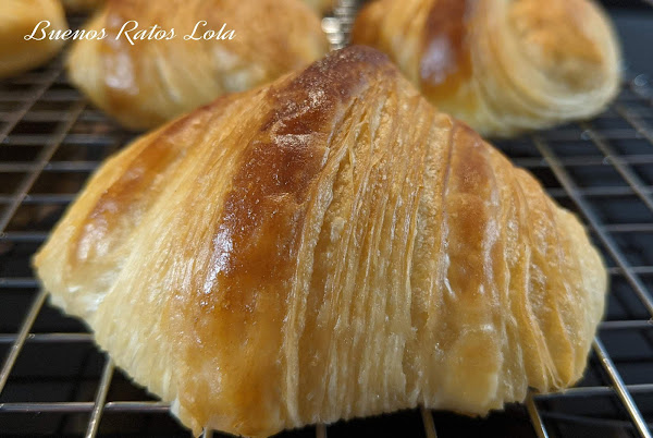 Con estas premisas opté por la receta de Sylvain Vernay (en su blog "Gourmétier") Unas explicaciones y videos estupendos con los que es sencillo preparar croissants. Y también metí la pata hasta el fondo: utilicé la menos indicada de las mantequillas posibles: la irlandesa Kerrygold que se ablanda en cuanto la sacas de la nevera. Y lo peor de todo es que lo sabía, estaba avisada, pero tenía 3 paquetes y para chula yo... ¡ja! En que hora. Aún así fui capaz de hacerlos y fue posible por la extensibilidad de mis harinas. Lo bueno es que fuí capaz de sacar un hojaldre bastante decente pese a lo difícil que me resultó laminar sin que se saliera la mantequilla. En cuanto vuelva el frío los hago de nuevo con una mantequilla más dura (pascual o presidente)
