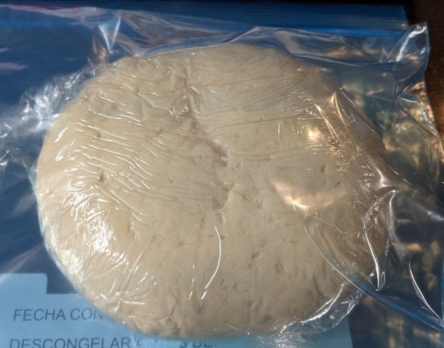 Aplanar un poquito y envolver en film transparente. Meter en bolsa de congelación y a la nevera (en la zona más fría) Como no nos interesa que fermente muy pronto podemos guardar en el congelador durante 20 minutos y luego dejar en el frigorífico durante mínimo 12 horas