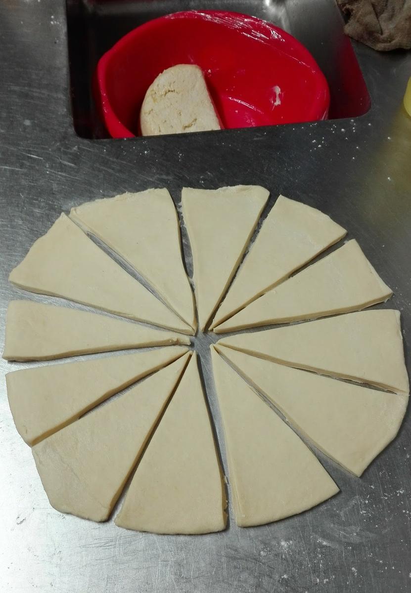 Damos un corte en la parte ancha de cada porción y enrollamos sobre si misma formando el croissant