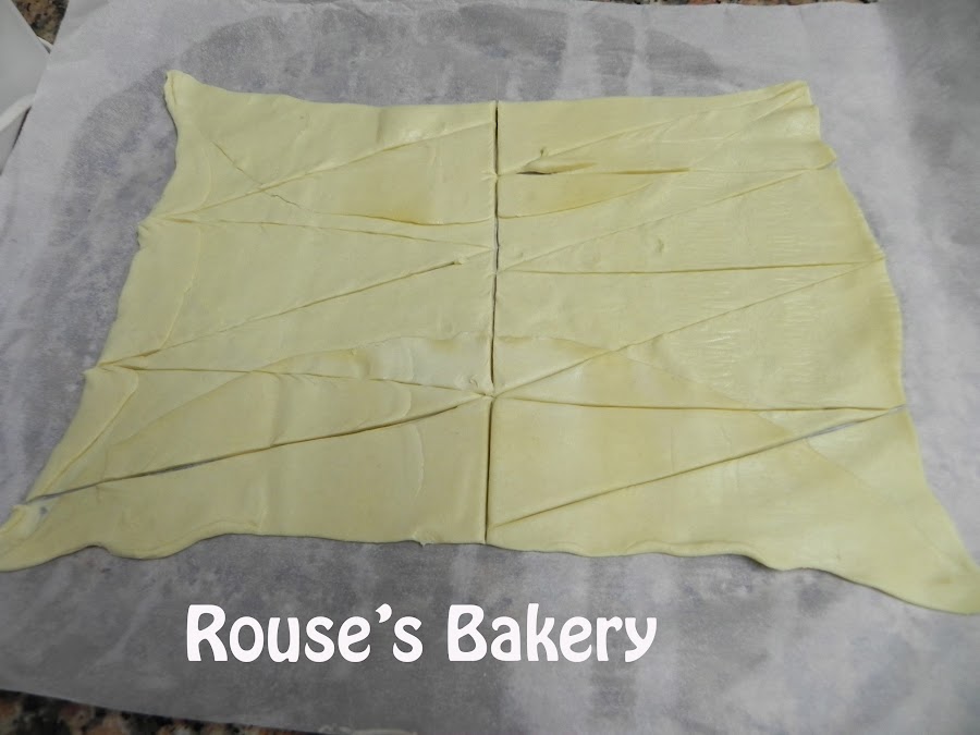 Encendemos el horno a 200ºC para que se vaya calentando. Extender la lámina sobre una superficie limpia. Y aquí me encontré con una dificultad: mi lámina era redonda. Que no cunda el pánico, doblamos los bordes, pasamos un poco el rodillo y ya es rectangular!. Cortamos el rectangulo grande en dos más pequeños, y estos dos en triángulos alargados.