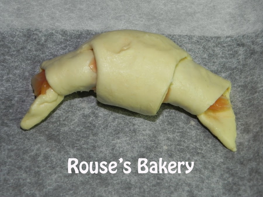 Enrollamos desde la parte ancha a la estrecha. Luego arqueamos un poco, para que tomen forma de C, la forma clásica de los croissants.