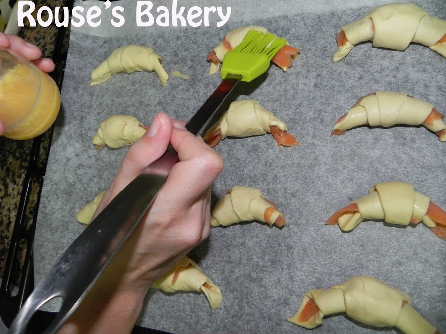 Los vamos colocando en una bandeja de horno donde habremos puesto un papel vegetal. Repetir la operación tantas veces como triángulos tengamos. Una vez los tengamos todos colocados en la bandeja los pintamos con el huevo batido y una brocha de cocina.