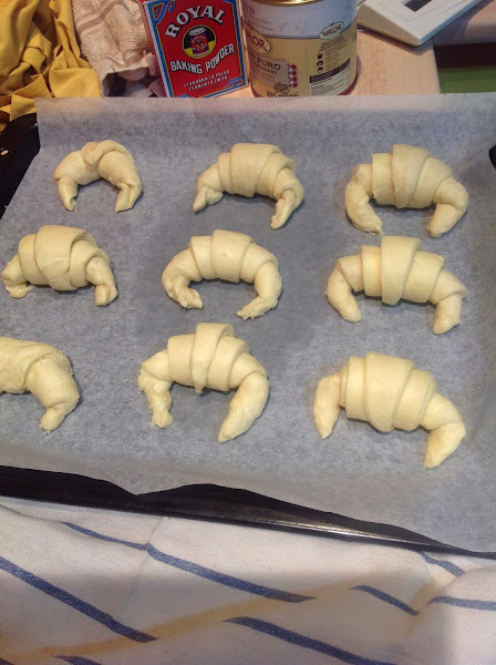Una vez hayan levado los croissants, los pincelamos con la mezcla y lo metemos al horno precalentado a 170º unos 10-15 minutos (los míos estuvieron entre 15-20 minutos porque mi horno es más bien flojito. Además, los puse en la bandeja segunda, empezando por abajo y no se doraron mucho. La segunda bandeja que metí, los puse en la tercera empezando por abajo y quedaron más doraditos). Bueno, como siempre digo, cada horno es un mundo.