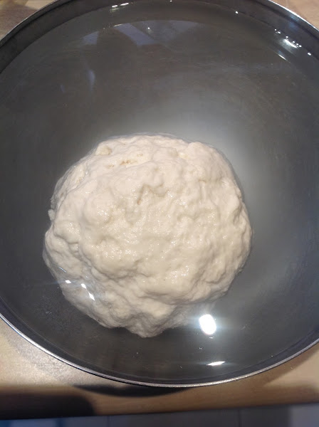 Llenamos otro bol grande con agua templada (es decir, que al meter el dedo no notemos ni frío ni calor) y ponemos la bola de masa dentro. El agua debe cubrir la masa. (Si el agua está demasiado caliente la bola se empezará a deshacer, por eso tiene que estar templada).