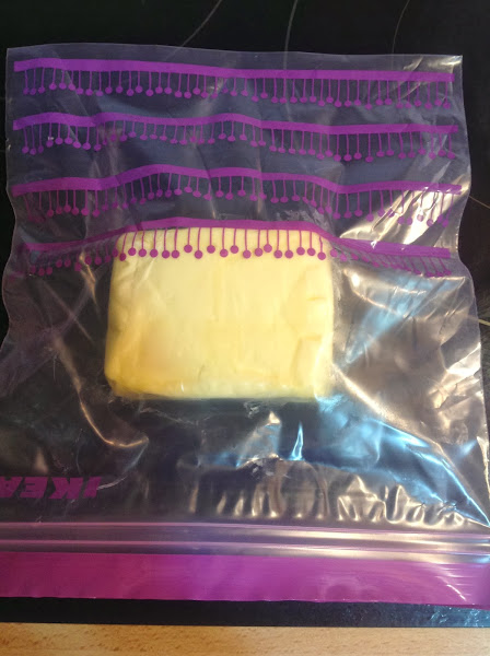 La mantequilla debe estar dura cuando la vayamos a utilizar y, hay que tocarla lo menos posible para que no se ablande y se rompa. Cortaremos la bolsa con unas tijeras para sacarla.