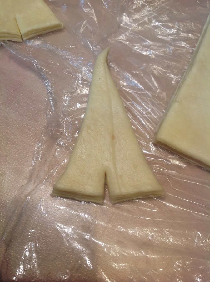 Estiramos la masa hasta que tenga unos 5 mm de grosor. Hacemos un rectángulo grande de unos 30x20 cm y vamos cortando triángulos de 10x20 cm. (La verdad es que lo del corte es un poco complicado para no desperdiciar mucha masa, por eso me decidí a hacer una plancha grande y a partir de ahí, cortar triángulos, así se aprovecha toda la masa de una vez).