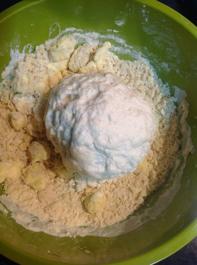A continuación, echamos la esponja y mezclamos bien con las manos o con una amasadora. (Yo esté paso lo hice con la amasadora para ir un poco más rápido pero no es necesario, porque luego tuve que pasarme a la forma manual).
