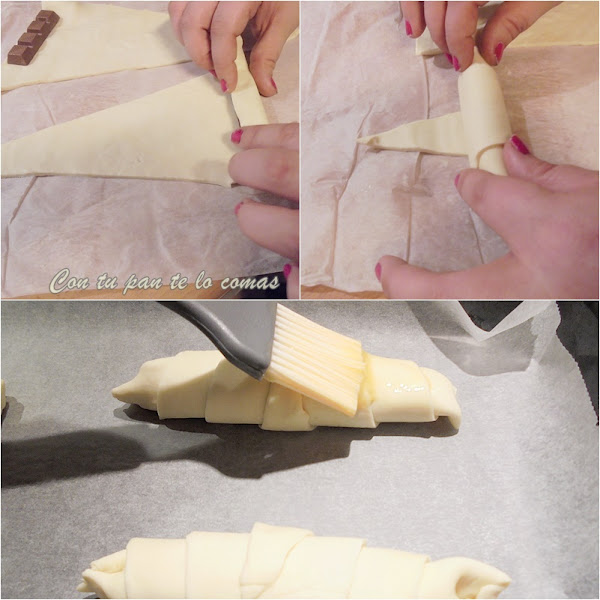 2. En el extremo grande de cada triángulo, coloca la barrita de chocolate y ve enrollando el croissant.