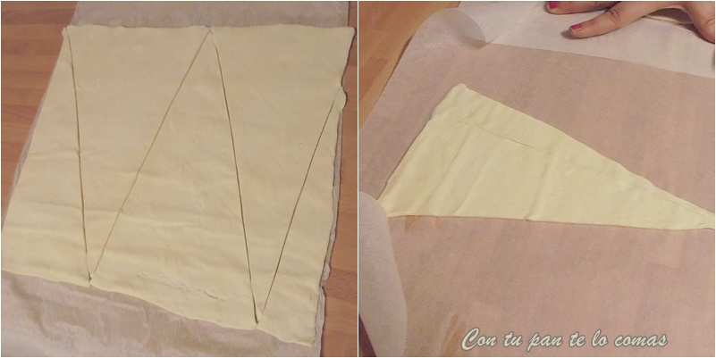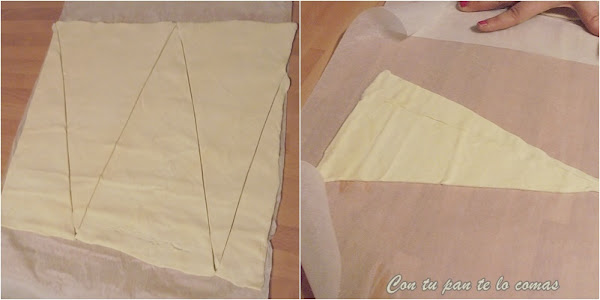 1. Corta el hojaldre como ves en la foto. Te saldrán 3 triángulos grandes y quedarán dos partes más pequeñas que habrá que unir como en la segunda foto para hacer el último del mismo tamaño que los otros.