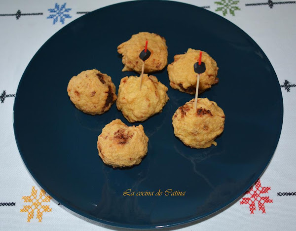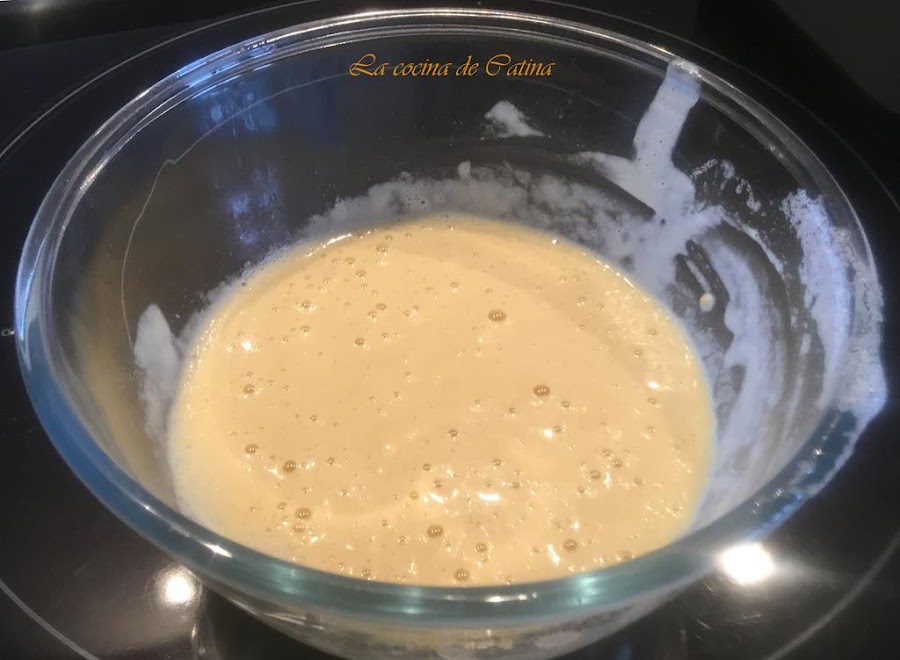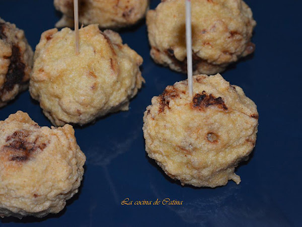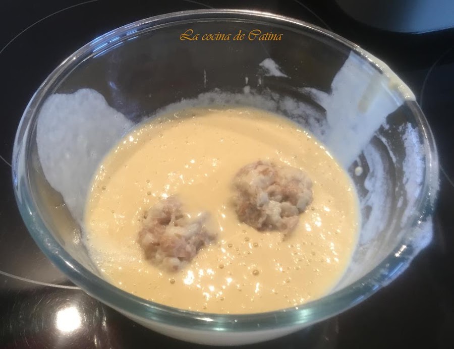 Una vez la masa fría, moldeamos unas croquetas en forma redonda y preparamos la pasta de fritura, separando la yema del huevo y mezclando con el resto de ingredientes para la pasta de fritura, cuando lo tenemos todo bien mezclado le añadimos la clara de huevo batida a punto de nieve.