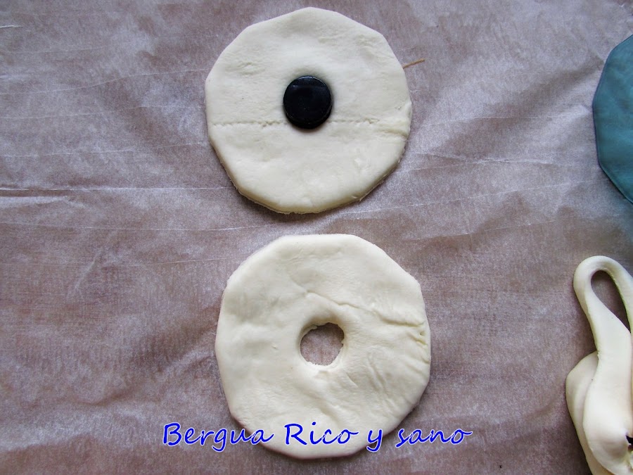 3. Entonces hacemos el agujerito en el centro; no muy grande, porque estamos haciendo donuts, no rosquillas. Yo uso el tapón de una botellita del tamaño de mi dedo índice.