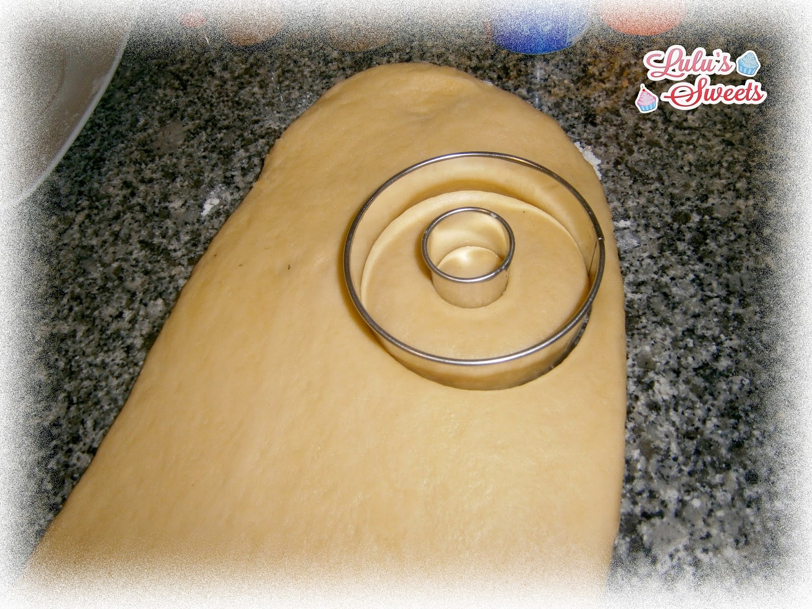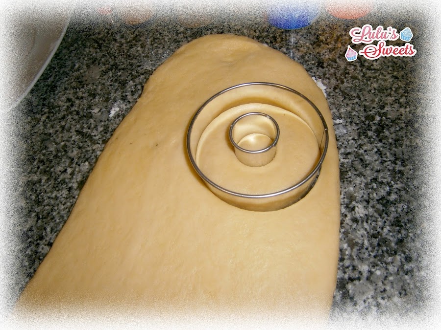 - La cortamos en forma de donut con la ayuda de un cortapastas redondo y para el agujero un cortapastas redondo más pequeñito (si no tienes puedes utilizar un vaso y para el agujero un tapón de una botella).