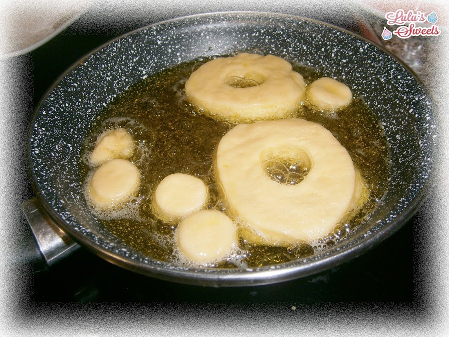 - Pomos bastante aceite de oliva en una sartén y vamos friendo los Cronuts, no poner muchos de golpe, como mucho de 2 en 2 y freímos unos 2 minutos por cada lado, hasta que queden hinchados y dorados.