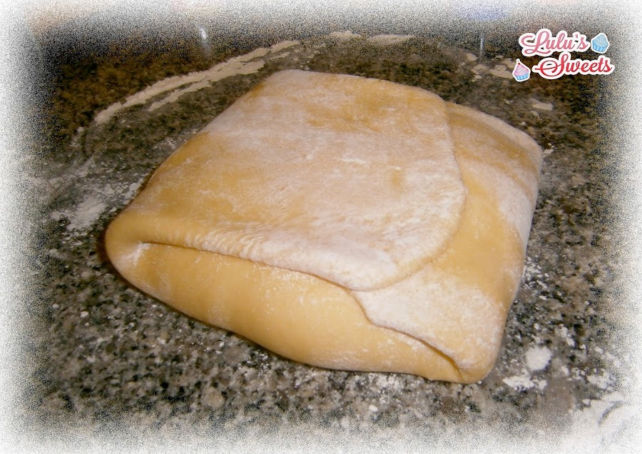 - Estiramos la masa de nuevo, y la doblamos, un extremo quedará a la mitad y el otro cubrirá toda la masa y dejamos reposar 20 minutos en la nevera.