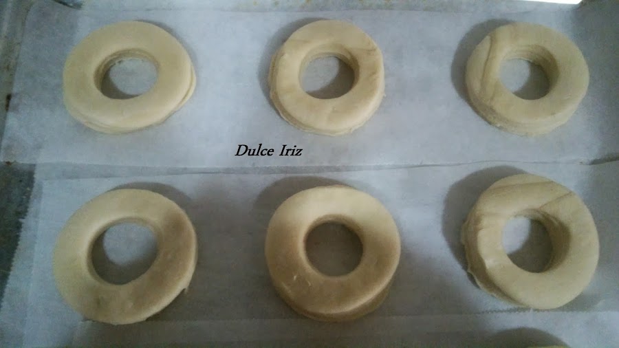 -Poner en una bandeja papel de horno y colocar los cronuts separados para que cuando suban no se peguen. Ir cortando hasta terminar toda la masa y cortar el papel de horno individual a cada cronut.