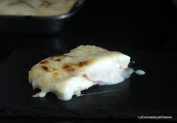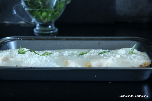 Prepara la bechamel o utiliza un brick, incorpora cada sandwich en una fuente de horno que has untado con mantequilla, vierte sobre cada uno de ellos. Añade queso rallado y yo le he puesto unas ramitas de romero de la huerta de Asuncionía que le da un aroma fantástico, es opcional, no imprescindible. Hasta aquí puedes tener preparado el Croque desde por la mañana, el final son diez minutos en los que ya no trabajas, sólo el horno.