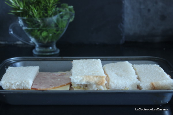 Si tu pan de molde tiene corteza, la retiras, no la tires puedes hacer unos bastoncitos pincelados con mantequilla diluida, queso rallado y unas semillas de sésamo, orégano, perejil o lo que tengas por ahí, introduces en el horno a la vez que el Croque Monsieur, te queda un aperitivo espectacular.