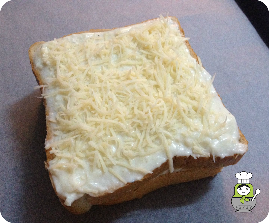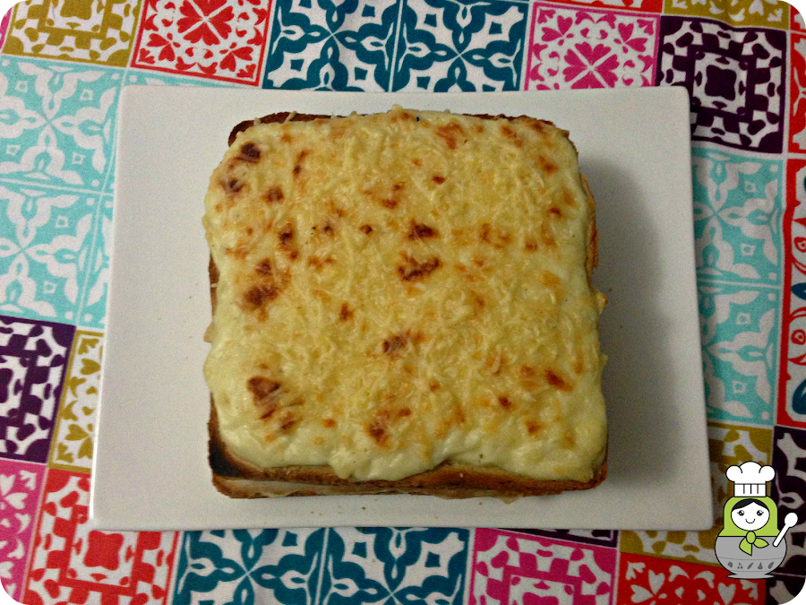 Untamos las rebanadas de pan con bechamel, colocamos el jamón en el interior y cerramos. Agregamos a la parte superior del sándwich una capa generosa de bechamel y por último, el queso rallado.