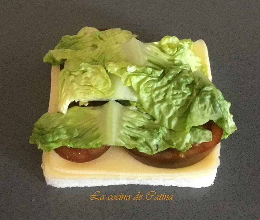 Lavamos y escurrimos las hojas de lechuga, después las troceamos en porciones pequeñas. Cojemos 4 rebanadas de pan y ponemos dos lonchas de queso cobre cada una,