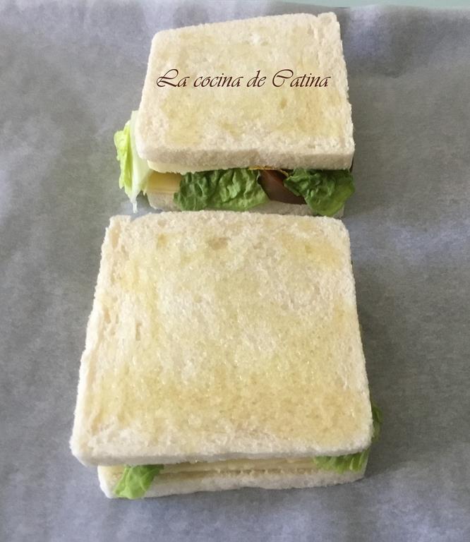 Ponemos el croque sobre una bandeja de horno con papel sulfurizado. Pintamos el pan con aceite de oliva.