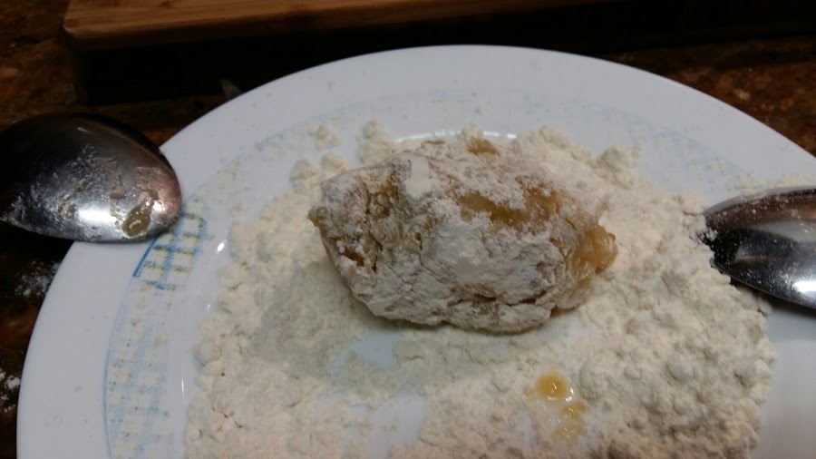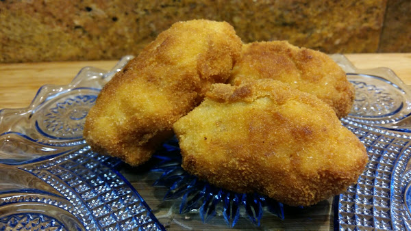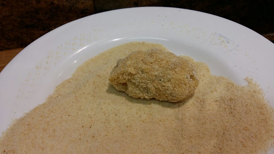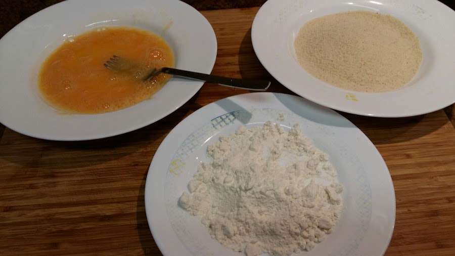 Rebozamos primero por harina, luego lo pasamos por huevo y finalmente por pan rallado