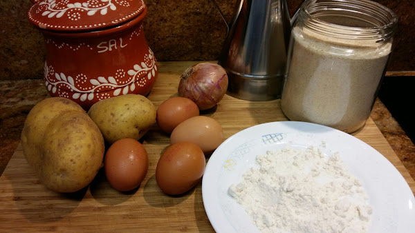 2 patatas más o menos grandes, 1 cebolla, 4 huevos, aceite de oliva, sal, harina y pan rallado.