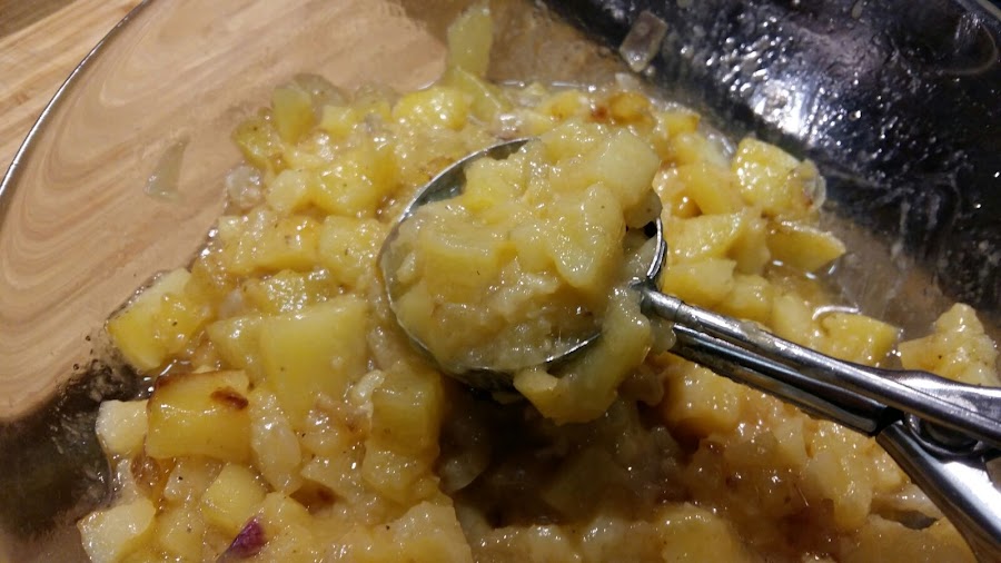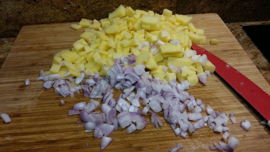 Empezamos cortado la patata y la cebolla igual que cuando vamos a hacer una tortilla de patatas.