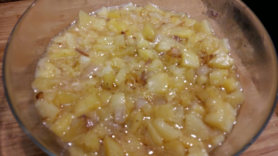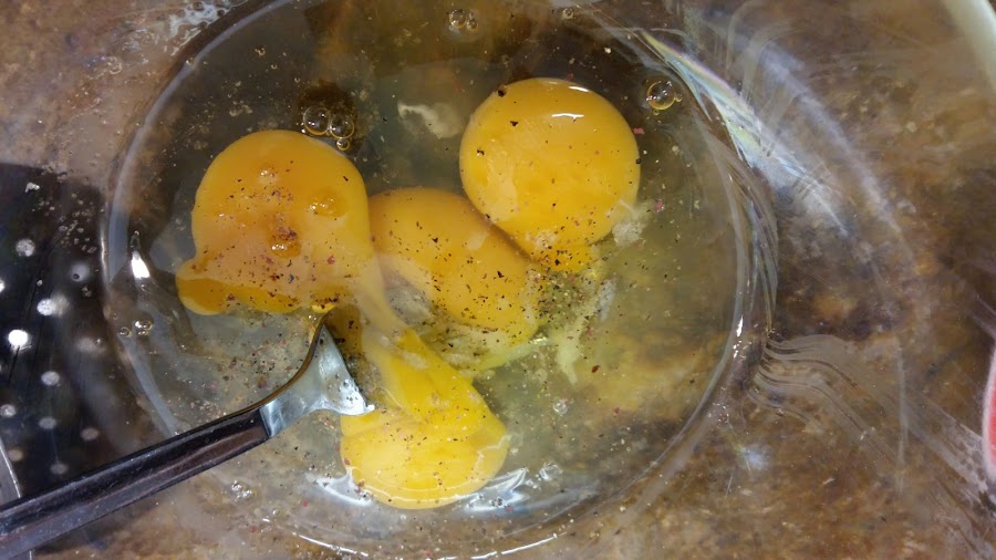 Pasamos un poco por la sarten como si fuésemos a hacer una tortilla para que el huevo cuaje un poco.No terminamos de hacer la tortilla.