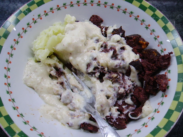 3.- Pelamos y cocemos una patata con un poco de sal y cuando esté hecha la machacamos, se la agregamos a la morcilla y removemos.